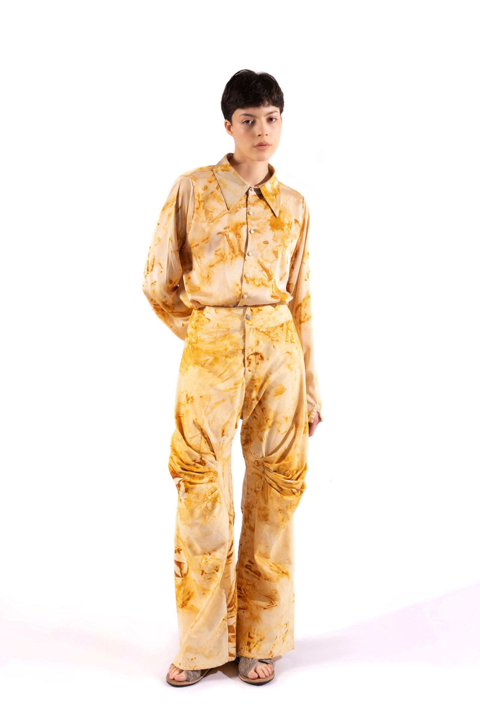 Pantalón de tiro medio. Teñido con óxido. Detalle drapeado en rodilla. Cierre frontal con cremallera y botón metálico. Detalle drapeado con volumen en la rodilla. Estos pantalones son una pieza divertida y llamativa.